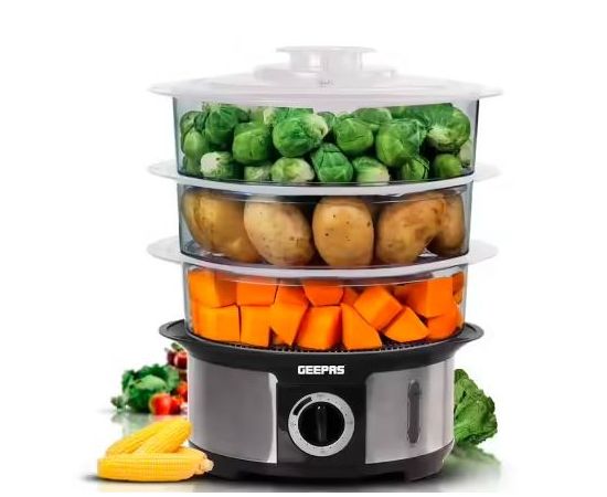 Geepas, 12L Food Steamer, Water Level Indicator,3 Transparent PC Bowls, 1000W