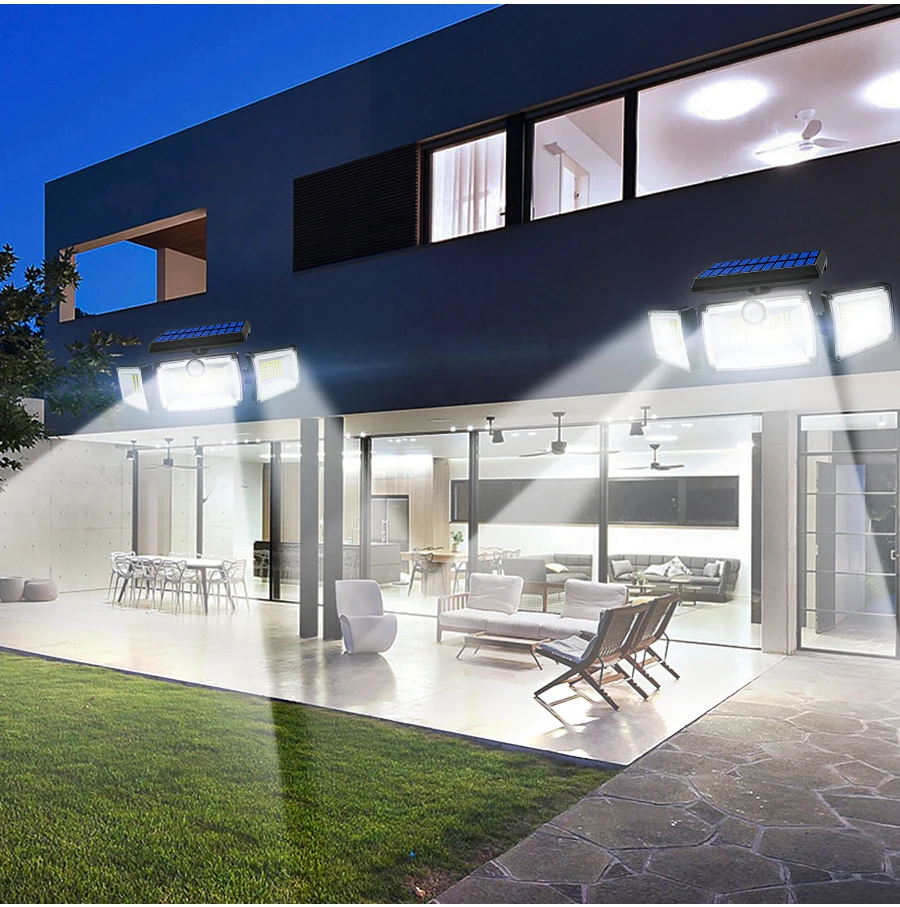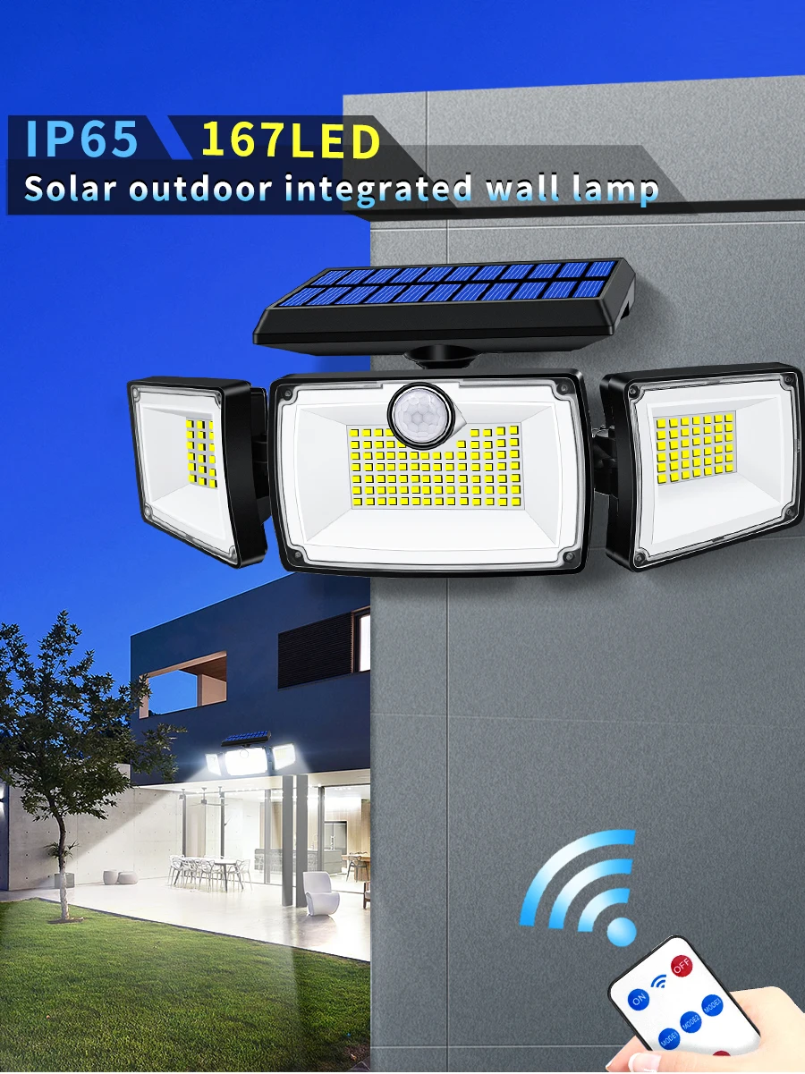 Security Solar Lights Outdoor 167 LED Adjustable 3 Heads with 3 Modes Wireless Motion Sensor Super Waterproof Spot Flood Lights